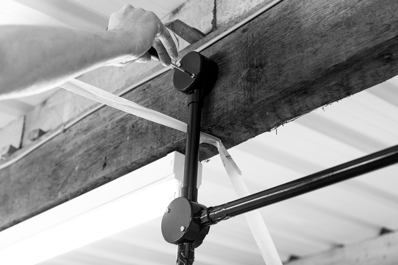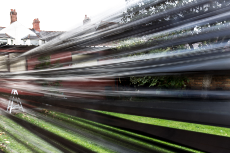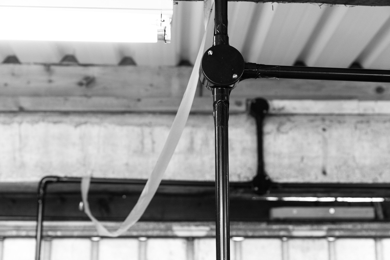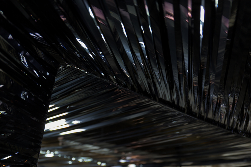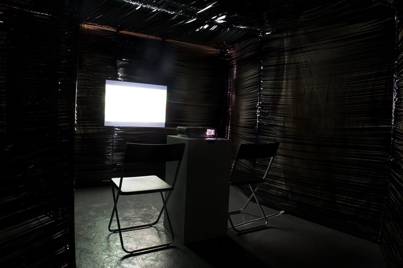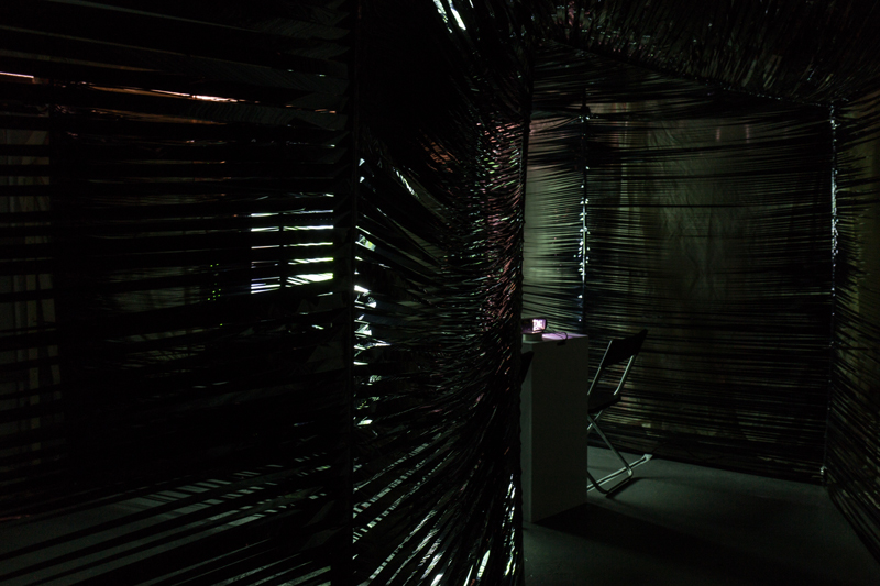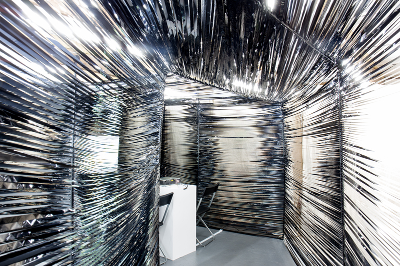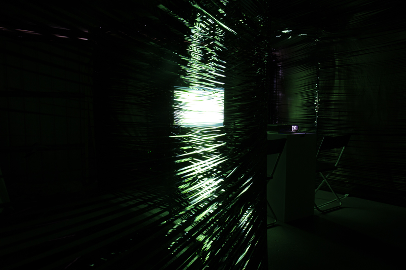 A lightweight structure, exploring reflection, symmetry and pattern, was formed from plastic electrical conduit and wrapped with old VHS tape, collected from local residents. The hidden memories and documents of everyday life contained within this magnetic tape cocooned the space, creating a unique, tactile and intimate viewing experience, complementing the artists’ work.