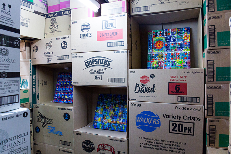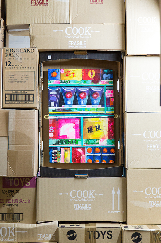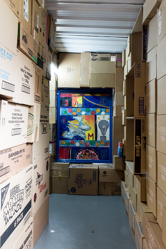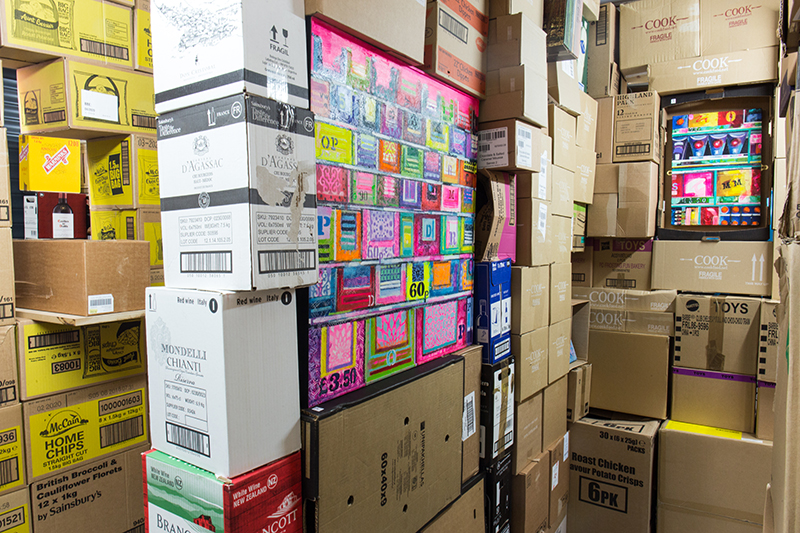 Studio Gennaio’s installation for Pop to the Shop! used locally-sourced supermarket boxes to create a navigable exhibition space for Christopher’s work. His vibrant paintings can be seen within and through random openings in the cardboard structure: imperfect, discarded bricks which do not hide their previous use. The viewer feels like they are in a supermarket, a warehouse. What is a museum, after all, but a storage depot for art?